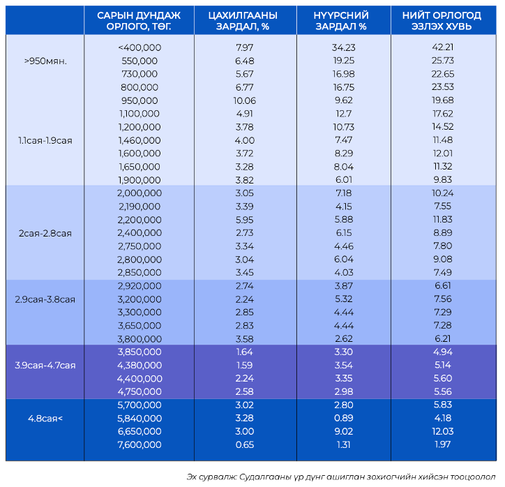 Судалгаанд хамрагдсан өрхүүд өвлийн улиралд дунджаар орлогын 11.04 хувийг эрчим хүчний зардалд зарцуулдаг. Өндөр орлоготой өрхүүд (сардаа 4.8 сая төгрөгөөс дээш орлоготой) эрчим хүчний хэрэглээнд орлогын ойролцоогоор 6 хувийг, хамгийн бага орлоготой өрхүүд (сардаа 950,000 төгрөгөөс доош орлоготой) орлогын 26.76 хувийг тус тус зарцуулж байна. Ялангуяа 400,000 төгрөгөөс доош сарын орлоготой өрхүүдийн хувьд эрчим хүчний дарамт хамгийн өндөр бөгөөд орлогынхоо 42.21 хувийг эрчим хүчний зардалд, үүний 34.23 хувийг зөвхөн нүүрсэнд зарцуулж байна. Эдгээр хамгийн бага орлоготой өрхүүд өвлийн улиралд орлогынхоо дунджаар 40 гаруй хувийг эрчим хүчний хэрэглээнд зориулж байна.