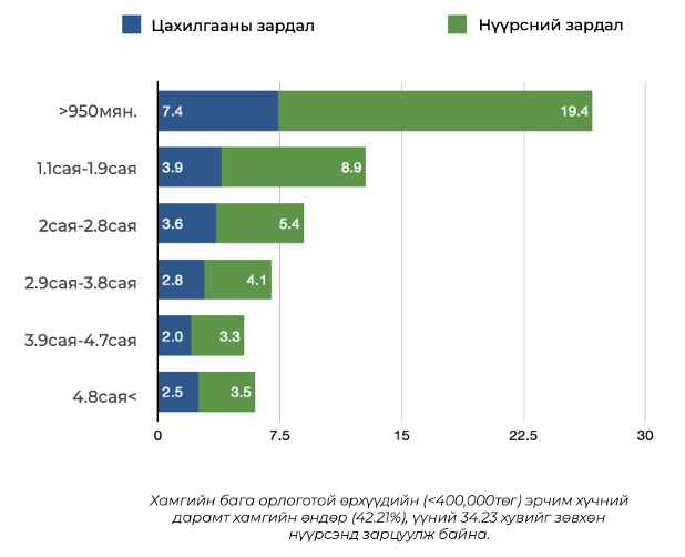Цахилгааны зардлын эзлэх хувь бага: Энэ бүлгийн өрхүүд цахилгааны зардалд орлогынхоо 7–8 хувийг зарцуулдаг, энэ нь дундаж болон өндөр орлоготой өрхүүдтэй харьцуулахад харьцангуй өндөр үзүүлэлт юм.