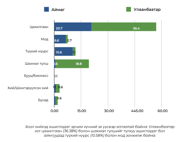 Түүхий нүүрсний хэрэглээ: Аймгуудад өрхийн 10.58% нь түүхий нүүрс хэрэглэдэг бол Улаанбаатарт энэ үзүүлэлт ердөө 1.06% байна. Энэ нь нийслэлд түүхий нүүрсний хэрэглээг хориглосон хатуу зохицуулалт мөрдөж байгаатай холбоотой. Түүнчлэн, Улаанбаатарын өрхийн 18.78% нь шахмал түлш ашигладаг бол аймгуудад ердөө 0.60% нь хэрэглэж байна. Хотын өрхүүд түүхий нүүрсний оронд харьцангуй цэвэр түлш болох шахмал түлшийг илүү өргөнөөр хэрэглэж байна.