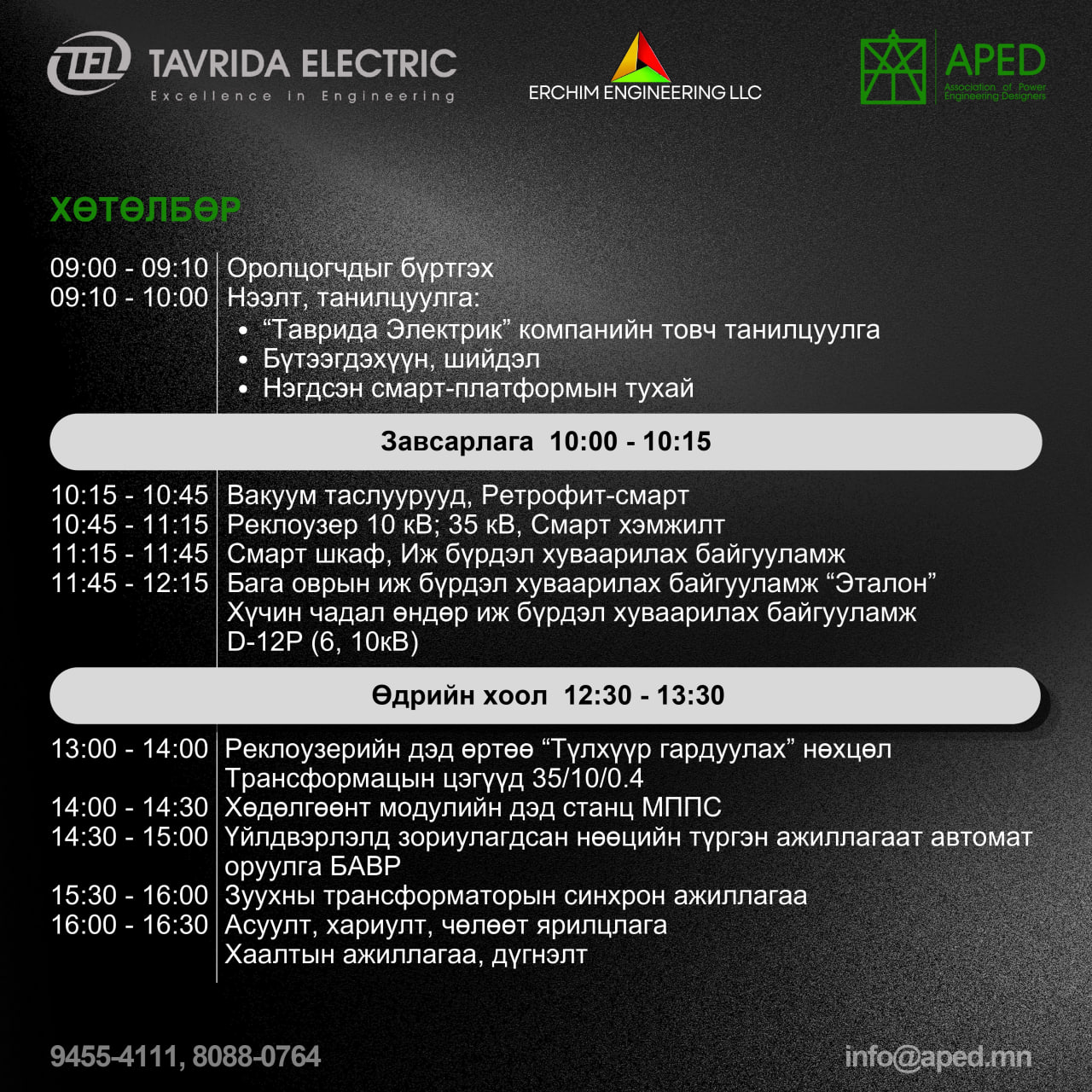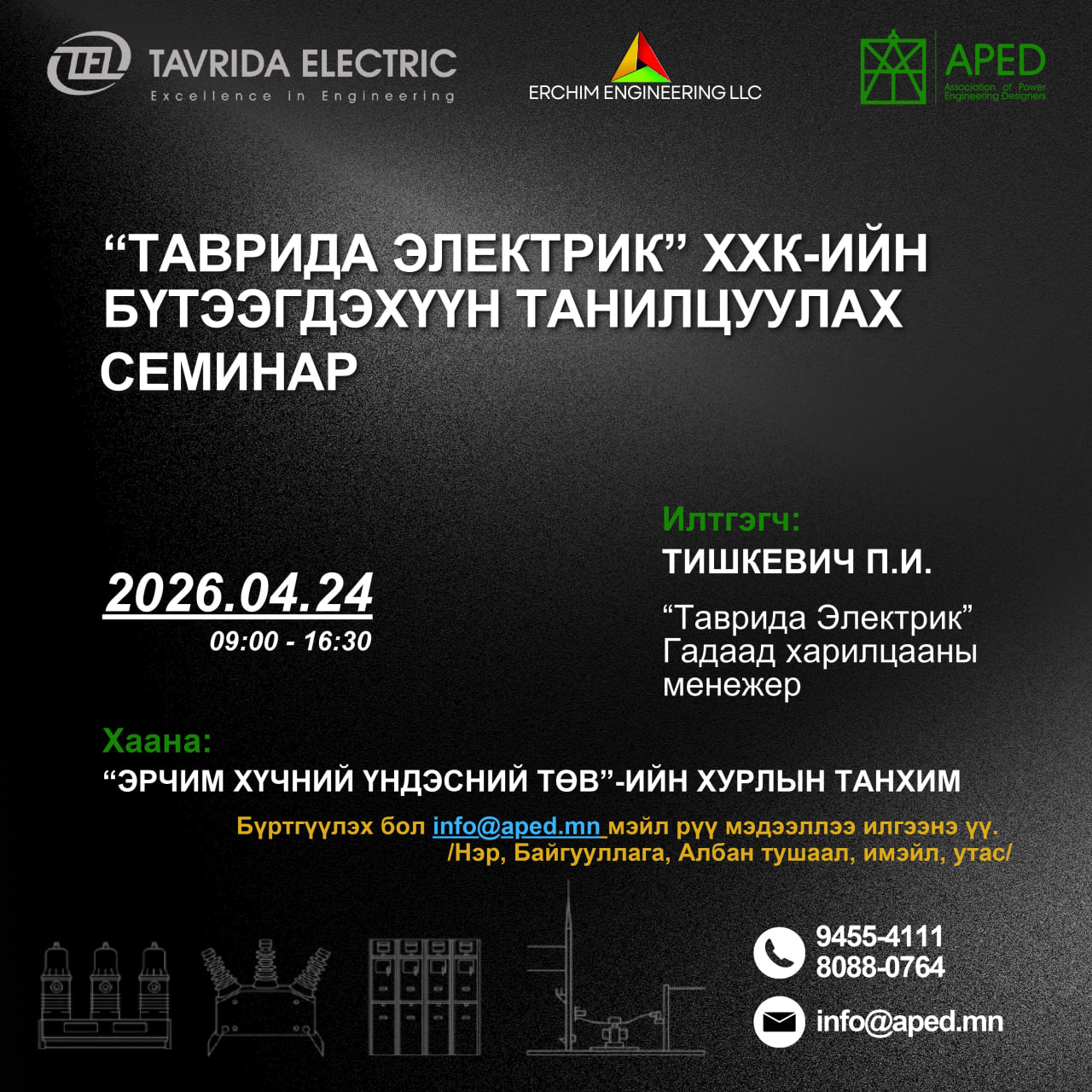 Таврида электрик ХХК, Эрчим инженеринг ХХК, Эрчим хүчний зураг төсөл зохиогчдын холбооноос хамтран зохион байгуулж буй Таврида электрик ХХК-ийн бүтээгдэхүүн танилцуулах семинар 2026 оны 4 дүгээр сарын 24-нд 09.00-16.30-д Эрчим хүчний үндэсний төвийн хурлын танхимд болно. Уг арга хэмжээний хүрээнд нэгдсэн смарт платформ, вакуум таслуур, ретрофит-смарт, реклоузер, смарт хэмжилт, смарт шкаф, иж бүрэн хуваарилах байгууламж, бага оврын иж бүрдэл хуваарилах байгууламж, хөдөлгөөнт модулийн дэд станц, үйлдвэрлэлд зориулагдсан нөөцийн түргэн ажиллагаат автомат оруулга зэрэг бүтээгдэхүүнийг танилцуулж, чөлөөт ярилцлага зохион байгуулах аж. Дэлгэрэнгүй мэдээллийг арга хэмжээний танилцуулгаас харна уу.